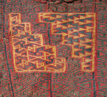 Detail of Ica Textile from the Ica Valley, Peru (photo by author). The Ica society flourished on the south coast of modern-day Peru from approximately 1000-1600CE. The hyper-arid conditions of the Ica Valley allows for the pristine preservation of a wide variety of Ica art such as this colorful textile fragment.