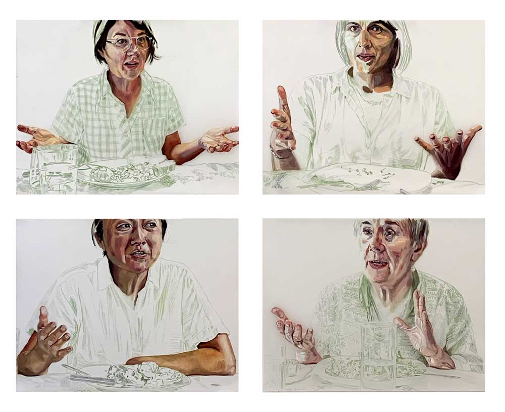 Lisa Wood, The Dinner Parties, Shawna, Meera, Lin, Claire, Oil and Coloured Pencil on Mylar, 2020.