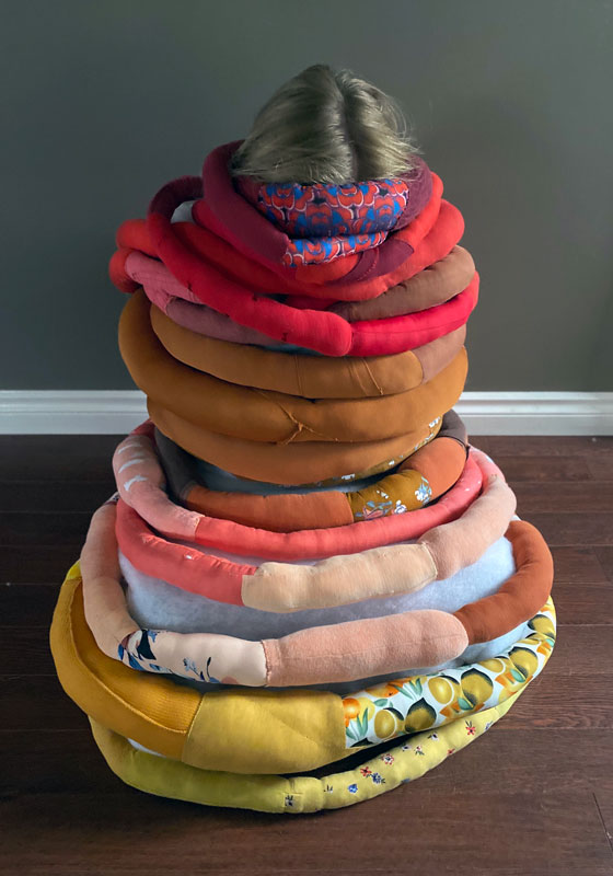 Raegan Moynes. Groundwork (sequester in progress), 2020, recycled clothing materials, polyester stuffing, quilting batting, thread.