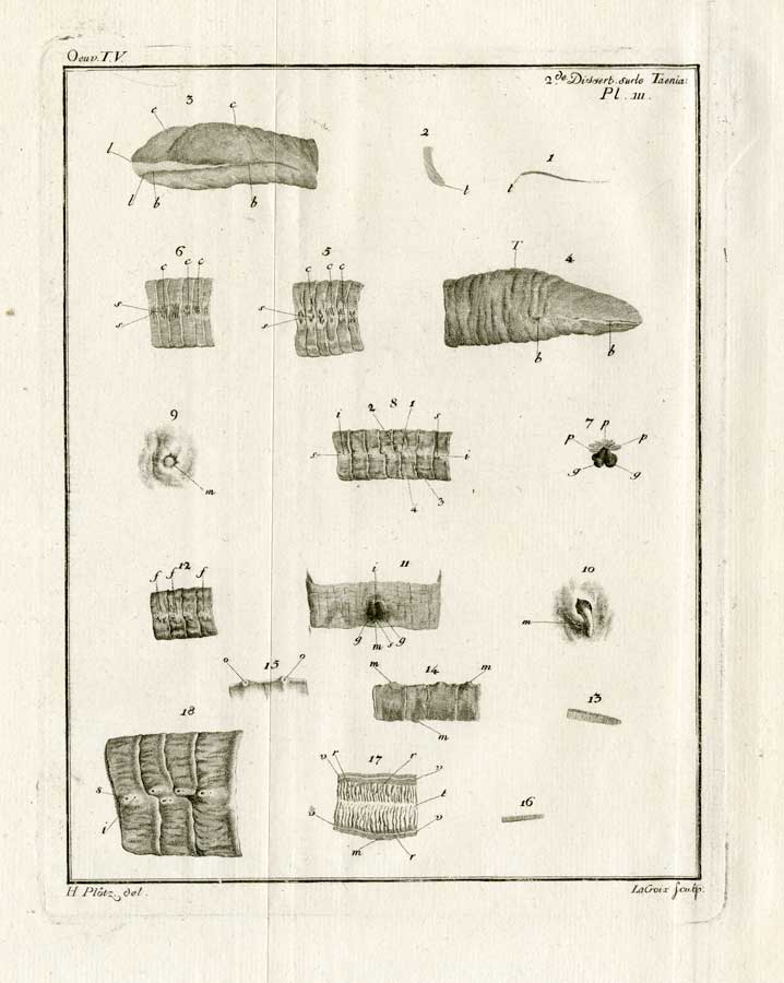 Henri Plötz, Tapeworms; plate III in Charles Bonnet's Œuvres d'histoire naturelle et de philosophie, t. 1. Neuchatel: Chez S. Fauche, 1779 [orig. 1777]. Image courtesy of Bruce Peel Special Collections & Archives, University of Alberta.