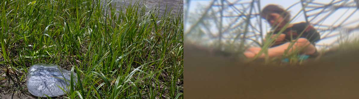 Lindsey Bond. Visiting memory: Grandmother swimming in the Battle River, Series: Ecosystems of Memory. Digital photograph, 40" x 20", photosculpture (plastic cast sewn together with silver gelatin photograph) 11" x 9" x 6", Battle River, Treaty 6 Territory, RM of Wilton, July 2020.