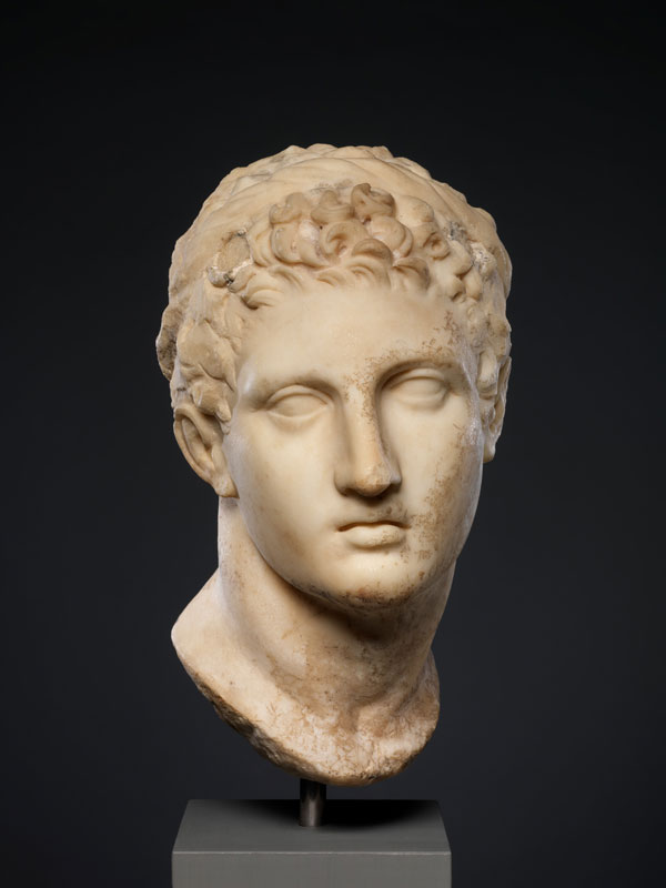 Portrait of a Horned Ruler Wearing a Diadem, 3rd-2nd c. B.C., marble with stucco, 13 7/8 x 7 5/8 x 9 7/8 in. (35.2 x 19.4 x 25.1 cm). Metropolitan Museum of Art, New York, 2012.479.10.