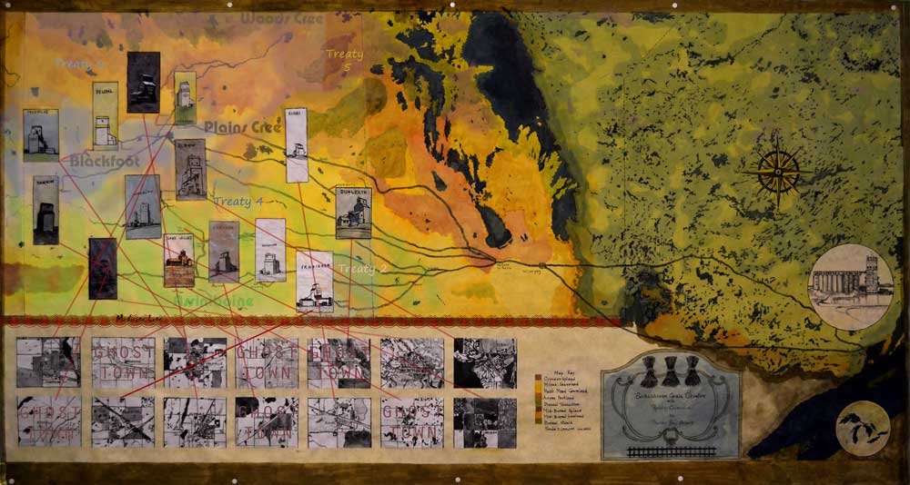 The process of mapping gives me, as an artist, a way to dig into the meanings behind the aesthetics of the individual elevator and dramatic western spaces. By changing my perspective from the “street view” of the grain elevator against the sky to the disembodied surveillance perspective of “satellite view,” I transform a personal impression into an analysis of ongoing natural and man-made systems. By drawing borders that quantify and categorize ecosystems, regions of exploitation, and points of control I call up issues of territorialization, ownership, and political power. Through mapping I infiltrate the disciplines of geography, economics, and history to show that not only grain elevators of rural Saskatchewan, but also the communities that depended on them, and the railways that connected them to Eastern markets, are a part of the armature of colonization used in the process of creating the Canadian state.