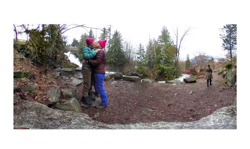 There is a tendency to think of digital art as a manipulation of information or as a synthetic process of world building. The work of Sylvia Grace Borda, as seen in her Kissing Project (2016-17) and What are you doing, Richmond? (2018), remains indexical reflecting the communities and people she engages with. There is much to discover in Borda’s work that may not be apparent to the casual viewer, including the challenges of their creation involving relationships with place, community individuals, and intergenerational audiences. Formatted in the now pervasive Google Street View, Borda’s work breaks with the Western canon of depiction of a fixed perspective while remaining fully grounded in the history of photography. One can see echoes in her work to much of that history, beginning with the diorama theatre of photography inventor Daguerre and extending through the work of contemporary artists. While the intimacy of kissing in photographs has often implied a sense of place, rarely has it been combined with the genre of the landscape. Most surprising to me is the connection of her work to Chinese scrolls with their ability to engage viewers to explore and discover the connections between people and place. And like any good relationship, that takes time.