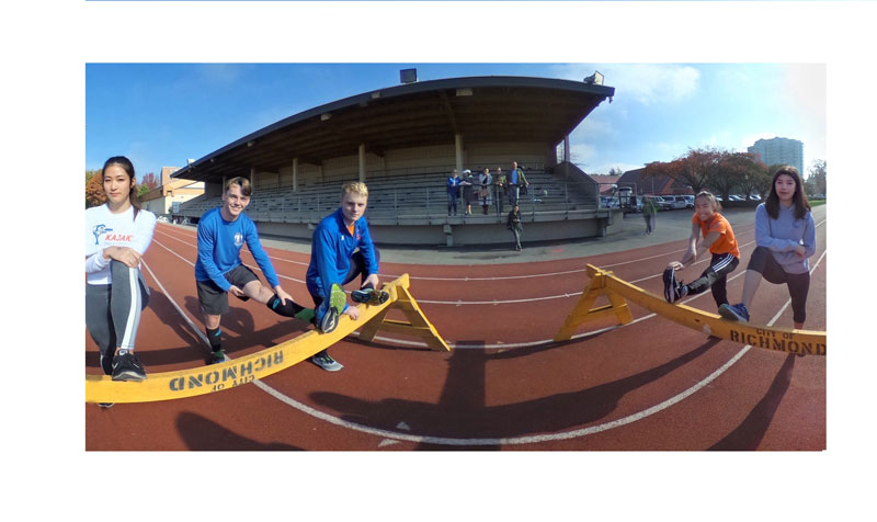 Kajak Youth track and field runners at Minoru Park, from the series What are you doing, Richmond?, 2018, C-41 print 24"x36", Collection of Richmond Public Art Program, Dimensional Google Street View portrait