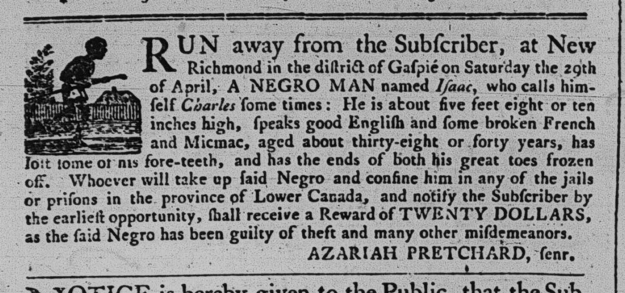 Azariah Pretchard Senr., RUN away from the Subscriber, Quebec Gazette, 22 May 1794, vol. 1506, p. 5, Bibliothèque et Archives nationales du Québec, Montreal.
