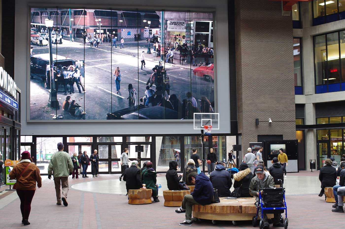 Stan Douglas, Abbott & Cordova, 7 August 1971 (2008), Woodward’s Atrium, Vancouver. © Stan Douglas. Courtesy of the artist, Victoria Miro, and David Zwirner.